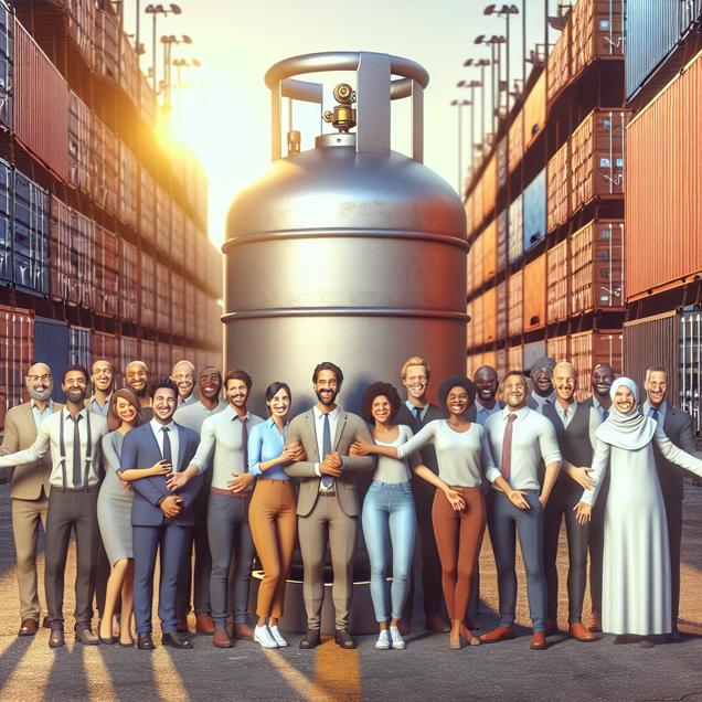 Prompt: [ A photo-realistic image ] A group of logisticians in the District of Columbia stands in front of a large Liquefied Petroleum Gas (LPG) cylinder, with happy expressions as they embrace the cylinder, symbolizing their love for LPG. In the background, a line of shipping containers labeled with "Qatar" waits, ready to be loaded with LPG. The logisticians are preparing to relocate and open LPG-themed restaurants in the desert, portraying a sense of excitement and purpose. The scene is bathed in warm, inviting light, adding to the sense of anticipation and adventure. The depiction should include only scenes, people, and objects, it should not include text or speech bubbles.