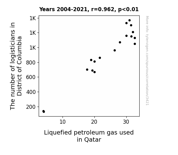 User prompt: Please provide potential search keywords for a paper titled Up in the Air: The Gas-tifying Link Between Logisticians in the District of Columbia and Liquefied Petroleum Gas in Qatar with an abstract of This paper delves into the correlation between the number of logisticians in the District of Columbia and the usage of liquefied petroleum gas (LPG) in Qatar. Harnessing data from the Bureau of Labor Statistics and the Energy Information Administration, we aimed to shed light on this seemingly improbable connection. Surprisingly, our analysis revealed a striking correlation coefficient of 0.9623388 and a p-value of less than 0.01 for the period spanning from 2004 to 2021. However, let's not gaslight ourselves into assuming causation just yet – although the statistical relationship may seem compelling, further investigation is needed to uncover the underlying mechanisms at play. Our findings add a dash of peculiarity to the field of logistics and energy, prompting us to take a lighthearted yet analytical approach to these unexpected intersections.