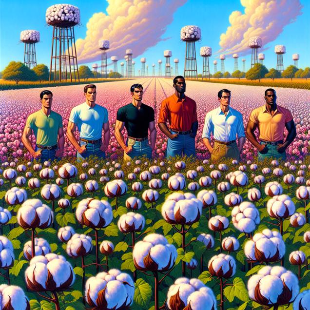 ChatGPT: Create an image of a vibrant California cotton field under the clear blue sky, with towering genetically modified cotton plants swaying in the breeze. In the distance, a group of single fathers, exuding strength and resilience, stand tall against the backdrop of the lush cotton field. Each father has gained unique abilities and a sense of empowerment from transformative spider bites caused by GMO-enhanced cotton-eating spiders. Show the fathers in a powerful and determined stance, ready to embrace the challenges of single parenthood. The image should capture the essence of newfound strength and the transformative impact of the genetically modified cotton in the lives of these fathers.