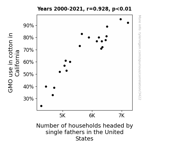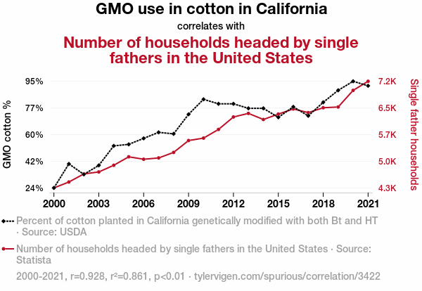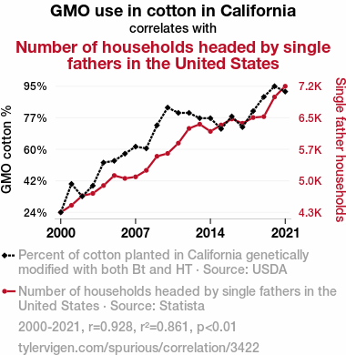 This means 86.1% of the change in the one variable (i.e., Number of households headed by single fathers in the United States) is predictable based on the change in the other (i.e., GMO use in cotton in California) over the 22 years from 2000 through 2021.