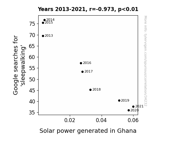This means 94.7% of the change in the one variable (i.e., Solar power generated in Ghana) is predictable based on the change in the other (i.e., Google searches for 'sleepwalking') over the 9 years from 2013 through 2021.