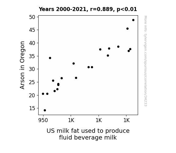 This means 79.1% of the change in the one variable (i.e., US milk fat used to produce fluid beverage milk) is predictable based on the change in the other (i.e., Arson in Oregon) over the 22 years from 2000 through 2021.