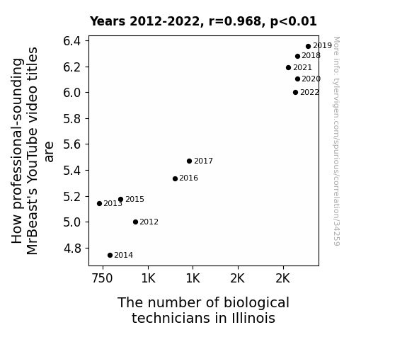 This means 93.8% of the change in the one variable (i.e., The number of biological technicians in Illinois) is predictable based on the change in the other (i.e., How professional-sounding MrBeast's YouTube video titles are) over the 11 years from 2012 through 2022.