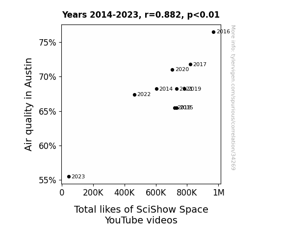 This means 77.8% of the change in the one variable (i.e., Total likes of SciShow Space YouTube videos) is predictable based on the change in the other (i.e., Air quality in Austin) over the 10 years from 2014 through 2023.
