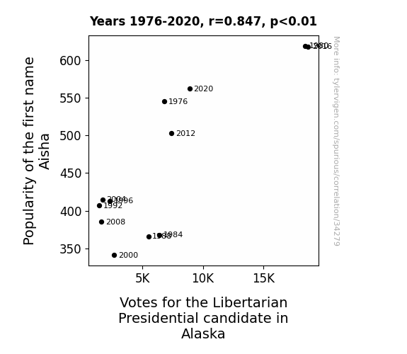 This means 71.8% of the change in the one variable (i.e., Votes for the Libertarian Presidential candidate in Alaska) is predictable based on the change in the other (i.e., Popularity of the first name Aisha) over the 12 years from 1976 through 2020.