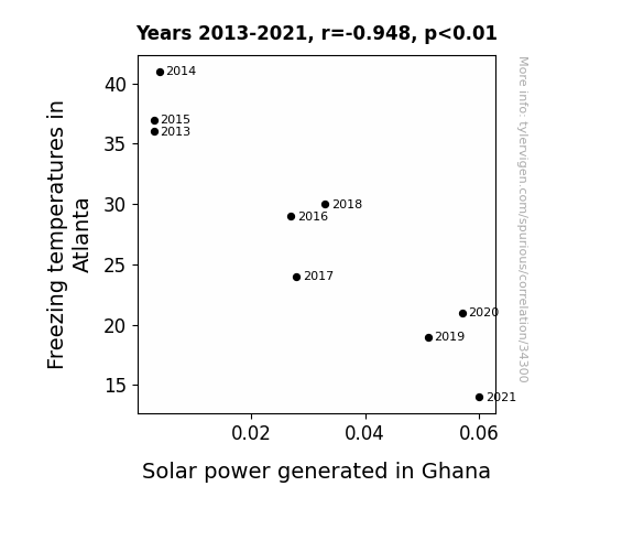 This means 89.9% of the change in the one variable (i.e., Solar power generated in Ghana) is predictable based on the change in the other (i.e., Freezing temperatures in Atlanta) over the 9 years from 2013 through 2021.