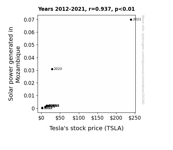 This means 87.7% of the change in the one variable (i.e., Tesla's stock price (TSLA)) is predictable based on the change in the other (i.e., Solar power generated in Mozambique) over the 10 years from 2012 through 2021.