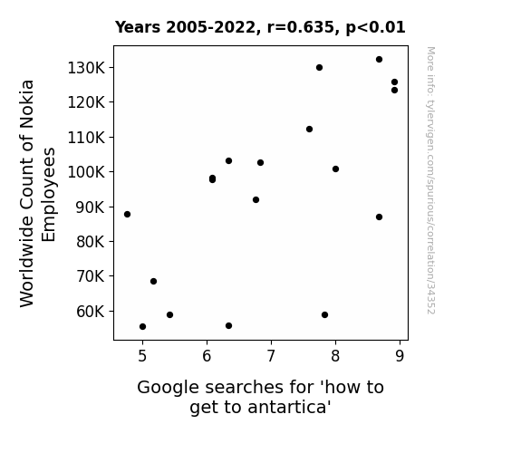 This means 40.3% of the change in the one variable (i.e., Google searches for 'how to get to antartica') is predictable based on the change in the other (i.e., Worldwide Count of Nokia Employees) over the 18 years from 2005 through 2022.