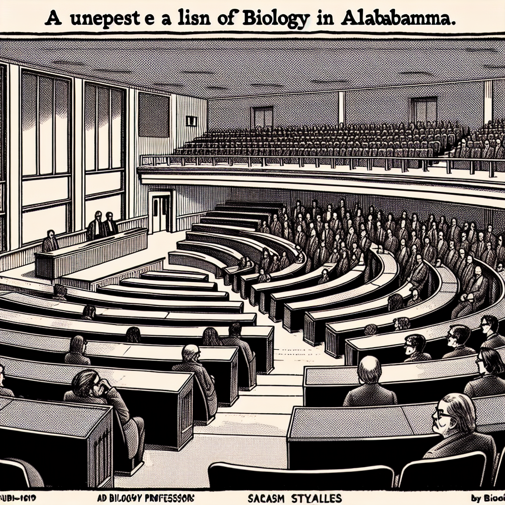Prompt: Generate an image that resembles a TIME magazine cover, featuring a quiet lecture hall at an Alabama university. The setting should show empty seats and a diminishing number of biology professors in attendance. Additionally, incorporate elements of dry humor by including xkcd comics about sarcasm becoming less frequent. The scene should exude a sense of solitude and wittiness, capturing the atmosphere of the deserted lecture hall with a subtle touch of humor. The depiction should include only scenes, people, and objects, it should not include text or speech bubbles.