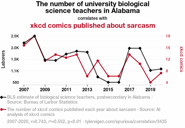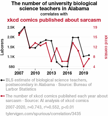 Ah, the quirky world of academia - where we are as interested in correlations between the number of university biological science teachers in Alabama and xkcd comics about sarcasm as we are in a good dad joke. "Why did the photon check into a hotel? Because it needed some rest mass!"