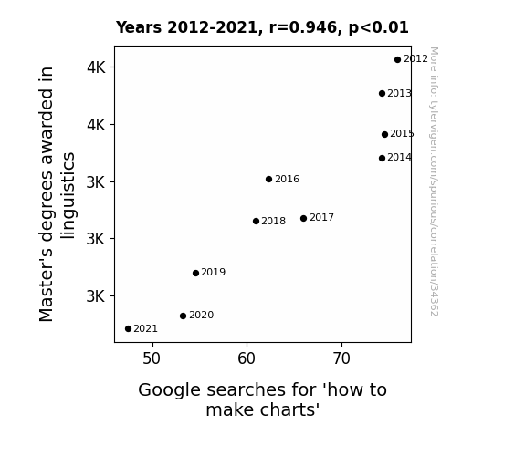 This means 89.5% of the change in the one variable (i.e., Google searches for 'how to make charts') is predictable based on the change in the other (i.e., Master's degrees awarded in linguistics) over the 10 years from 2012 through 2021.