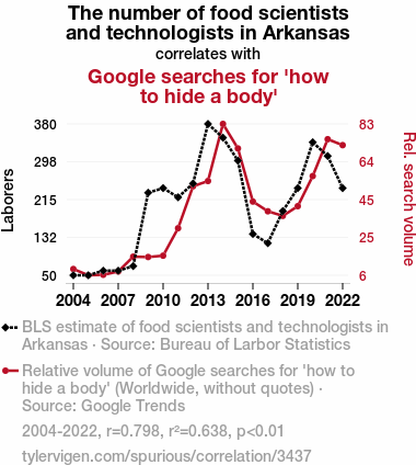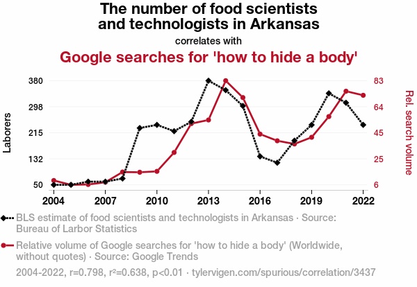 food scientists, technologists, Arkansas, Google searches, 'how to hide a body', correlation, culinary science, Bureau of Labor Statistics, Google Trends, data analysis, search engine queries, clandestine activities, internet inquiries, human behavior
