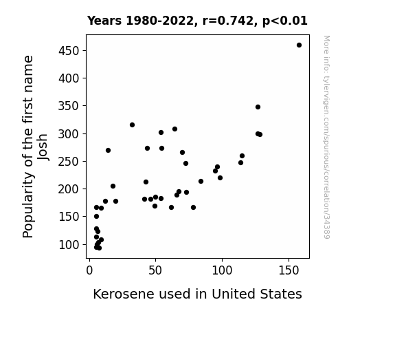 A linear line chart with years as the X-axis and two variables on the Y-axis. The first variable is Popularity of the first name Josh and the second variable is Kerosene used in United States.  The chart goes from 1980 to 2022, and the two variables track closely in value over that time. Small Image