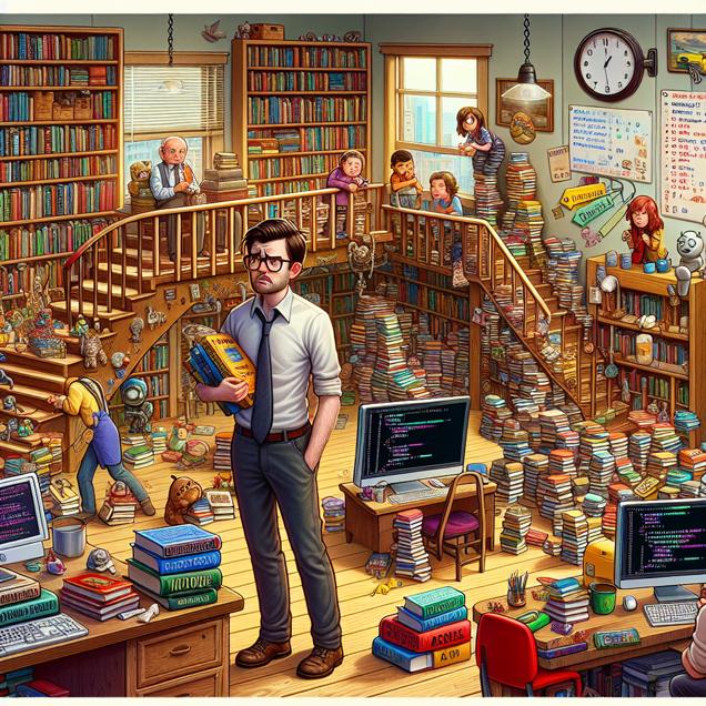 User prompt: Please respond with an image generation prompt that would be likely to create an interesting visual using DALLE-3, using the following style: [ Cutsy art illustration ] and depicting this scene: In a cozy North Dakota library, the once bustling team of helpful library assistants now stands diminished, leaving shelves of books unattended. Meanwhile, in a nearby office, Randall Munroe, the creator of xkcd, sits at his desk surrounded by piles of programming reference materials, with a frustrated expression as he struggles to find inspiration for his next comic on programming. Keep the visual depiction simple. Do not include any words or speech bubbles.