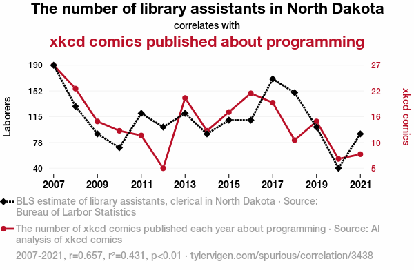 - The spurious research paper: Checking Out the Relationship Between Library Assistants in North Dakota and xkcd Comics on Programming: A Statistical Analysis