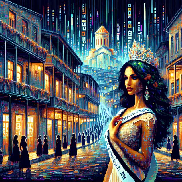 User prompt: Please respond with an image generation prompt that would be likely to create an interesting visual using DALLE-3, using the following style: [ Data cyber art ] and depicting this scene: In a charming Georgian town, an increasing number of calculators line the streets, diligently crunching numbers. As the calculators hum with activity, Miss America is seen aging in fast-forward, her radiant beauty transforming as time seems to speed up around her. The growing crowd of actuaries and the rapidly aging Miss America visually illustrate the unique relationship between these two variables. Keep the visual depiction simple. Do not include any words or speech bubbles.