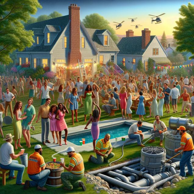 Prompt: An image generation prompt likely to create an interesting visual using DALLE-3 in photorealism style, depicting a cozy New Hampshire neighborhood, would be: "Generate an image of a bustling house party in a cozy New Hampshire neighborhood. The scene is filled with the sound of laughter and music, as friends and family enjoy each other's company. In the background, a team of busy sewer pipe cleaners and septic tank servicers are hard at work, ensuring that the increased flow of liquids from the festivities doesn't cause any plumbing issues. Capture the coziness of the neighborhood and the vibrant activity of the party, with a focus on the hardworking sewer maintenance team in the background. Highlight the seamless coexistence of the lively gathering and the diligent workers keeping the sewer system well-maintained." The depiction should include only scenes, people, and objects, it should not include text or speech bubbles.
