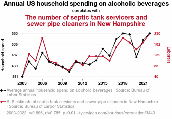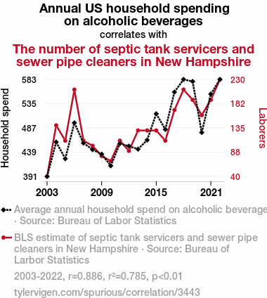 US household spending on alcoholic beverages, septic tank servicers, sewer pipe cleaners, New Hampshire, correlation coefficient, Bureau of Labor Statistics, implications, annual spending, lighthearted observations