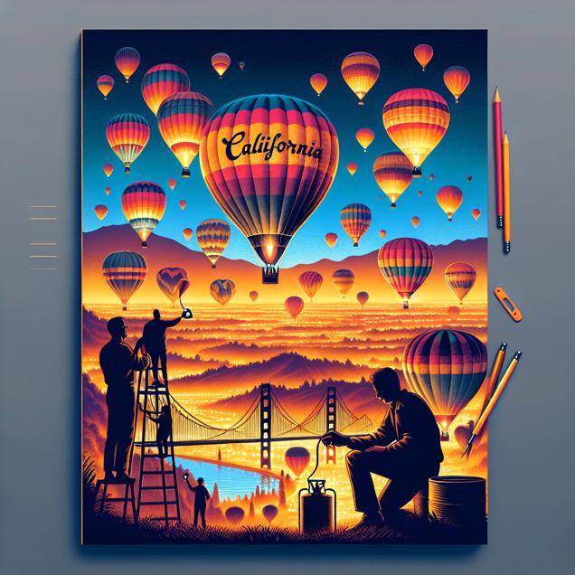 Prompt: Generate an image showing a TIME magazine cover with a vibrant California landscape featuring hot air balloons filling the sky. In the foreground, include the silhouette of people in Sudan laboring to fuel the balloons with kerosene, creating a warm, glowing atmosphere against the night sky. The image should capture the energy of California's ballooning enthusiasts and the industriousness of the workers in Sudan, conveying an atmosphere of excitement and diligent activity. The depiction should include only scenes, people, and objects, it should not include text or speech bubbles.