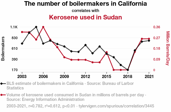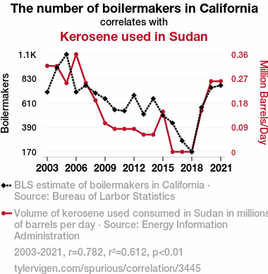 - The spurious research paper: Boiling Point: Exploring the Surprising Link Between Boilermakers in California and Kerosene Consumption in Sudan