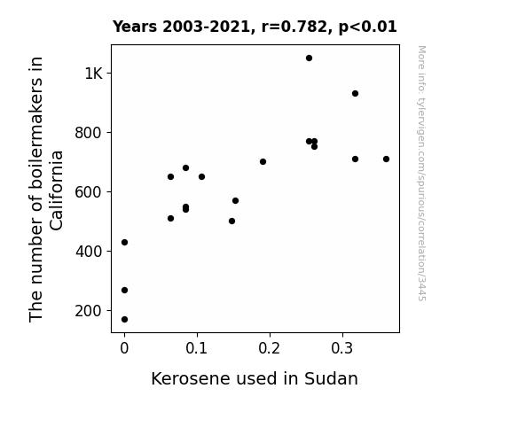 This means 61.2% of the change in the one variable (i.e., Kerosene used in Sudan) is predictable based on the change in the other (i.e., The number of boilermakers in California) over the 19 years from 2003 through 2021.