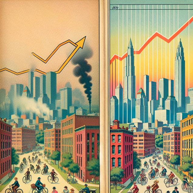 Prompt: Prompt: Generate an image in the style of a TIME magazine cover depicting Tallahassee with once smoggy horizons now replaced by clear blue skies. Show residents joyfully biking to work with a noticeable decrease in air pollution. Include a prominent display of the BP stock ticker showing a steady upward trend, representing increased demand for petroleum products and driving up their stock price. The depiction should include only scenes, people, and objects, it should not include text or speech bubbles.