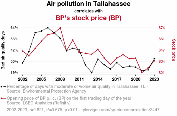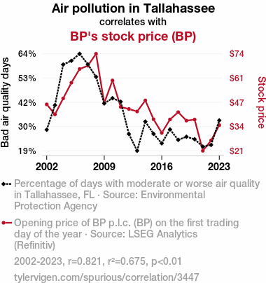 This means 67.5% of the change in the one variable (i.e., BP's stock price (BP)) is predictable based on the change in the other (i.e., Air pollution in Tallahassee) over the 22 years from 2002 through 2023.