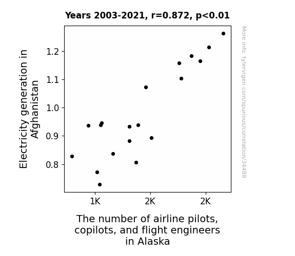 This means 76% of the change in the one variable (i.e., The number of airline pilots, copilots, and flight engineers in Alaska) is predictable based on the change in the other (i.e., Electricity generation in Afghanistan) over the 19 years from 2003 through 2021.