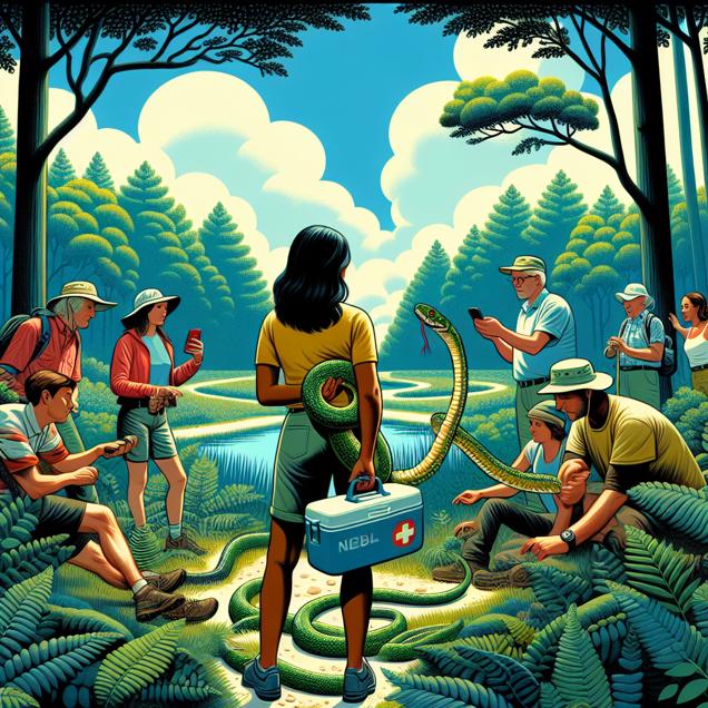 Prompt: "Generate an image of a serene forest clearing in Huntington, Indiana, with clear blue skies and lush greenery. People are seen strolling and taking in the fresh air. In the center, a group of hikers surround a snake. One of them is confidently using a first aid kit to treat the snake bite, while the others look on with reassurance. Meanwhile, in the background, a dropped phone displays a Google search for 'how to treat a snake bite', but it's no longer needed." The depiction should include only scenes, people, and objects, it should not include text or speech bubbles.
