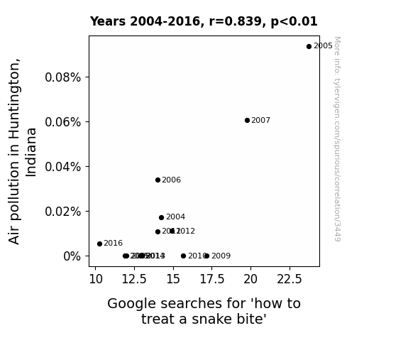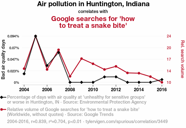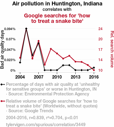 - The spurious research paper: The Toxic Tails: A Slithering Connection Between Air Pollution in Huntington, Indiana and Google Searches for 'How to Treat a Snake Bite'