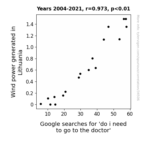 The excessive wind power in Lithuania led to a surge in kite-flying, resulting in an epidemic of accidental self-injections with tiny splinters. Remember, when it doubt, always get a check-up, just to be on the safe side!Discover a new correlation
