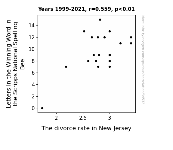 This means 31.2% of the change in the one variable (i.e., The divorce rate in New Jersey) is predictable based on the change in the other (i.e., Letters in the Winning Word in the Scripps National Spelling Bee) over the 23 years from 1999 through 2021.