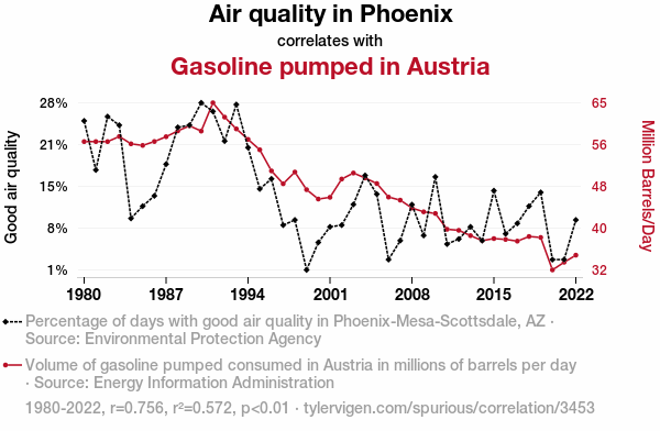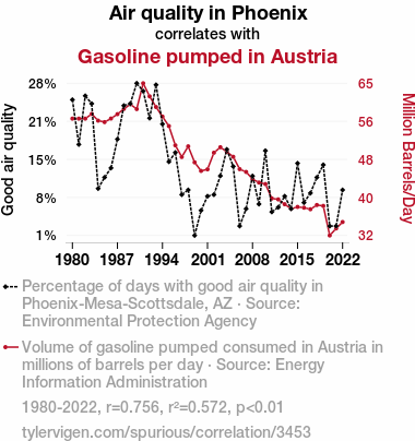 This means 57.2% of the change in the one variable (i.e., Gasoline pumped in Austria) is predictable based on the change in the other (i.e., Air quality in Phoenix) over the 43 years from 1980 through 2022.