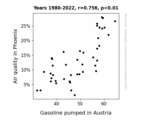 The analysis of the data from 1980 to 2022 revealed a significant positive correlation of 0.7564606 between air quality in Phoenix and the amount of gasoline pumped in Austria. This finding suggests that as the level of gasoline pumping in Austria increased, air quality in Phoenix improved, leaving us pondering if gasoline fumes could be the next eco-friendly solution *wink*.