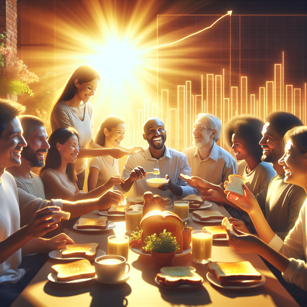 User prompt: Please respond with an image generation prompt that would be likely to create an interesting visual using DALLE-3, using the following style: [ A photo-realistic image ] and depicting this scene: Amidst the rising sun, people happily spread butter on their toast, smiles lighting up their faces as they savor the creamy delight. In the background, the stock price ticker for Illumina (ILMN) climbs steadily, mirroring the growing excitement and optimism among investors. Keep the visual depiction simple. Do not include any words or speech bubbles.