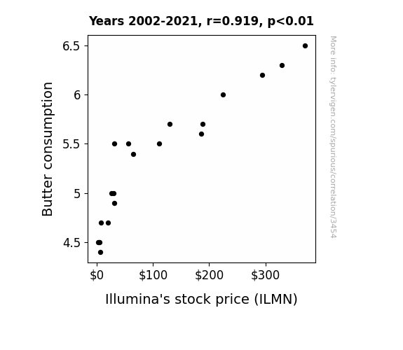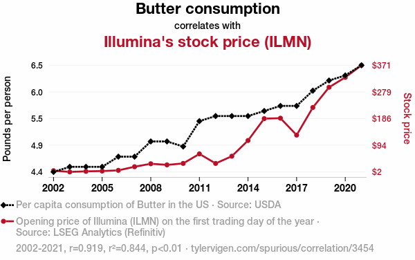 As butter consumption increases, so does happiness. Happy people are more productive. With increased productivity, companies like Illumina experience higher stock prices as a result of the butter-induced productivity boost. It's a slippery but profitable correlation!