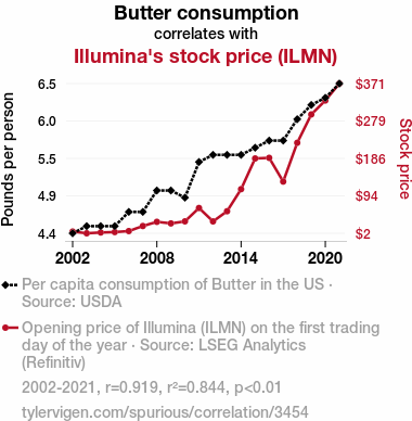 butter consumption, Illumina stock, USDA data, LSEG Analytics, correlation, stock prices, investment strategy, dairy market, statistical significance, butter consumption trends, stock price correlation