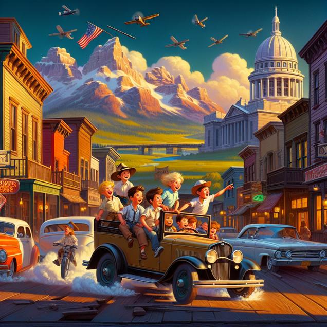 User prompt: Please respond with an image generation prompt that would be likely to create an interesting visual using DALLE-3, using the following style: [ An image that looks like it is a scene from a Pixar movie ] and depicting this scene: In a small town in Wyoming, the name Benny has become increasingly popular among parents. As more and more children are named after the infamous car thief, Benny the Bandit, a group of young Bennys are now seen joyriding stolen cars across the state. The sound of screeching tires and flashing police lights fills the air as motor vehicle thefts soar in correlation with the rise in the name Benny. Keep the visual depiction simple. Do not include any words or speech bubbles.