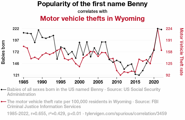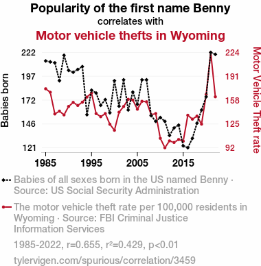 Benny, birth name, bandits, baby names, burglaries, Wyoming, motor vehicle theft, correlation, US Social Security Administration, FBI Criminal Justice Information Services, correlation coefficient, statistical significance, nomenclature, nefarious deeds, whimsical window