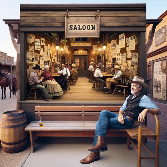 ChatGPT: Generate an image of a quaint Nevada town with a vintage saloon as the focal point. The saloon should have a charming, old western design with a wooden exterior and swinging doors. Inside, the saloon is bustling with colorful characters enjoying a relaxed atmosphere. The town sheriff sits outside on a wooden bench, basking in a moment of peace, while the once numerous "wanted" posters with "Jesse"'s name on them have been replaced with cheerful community notices. The overall scene should radiate a feeling of tranquility and camaraderie amidst the cozy Wild West setting.