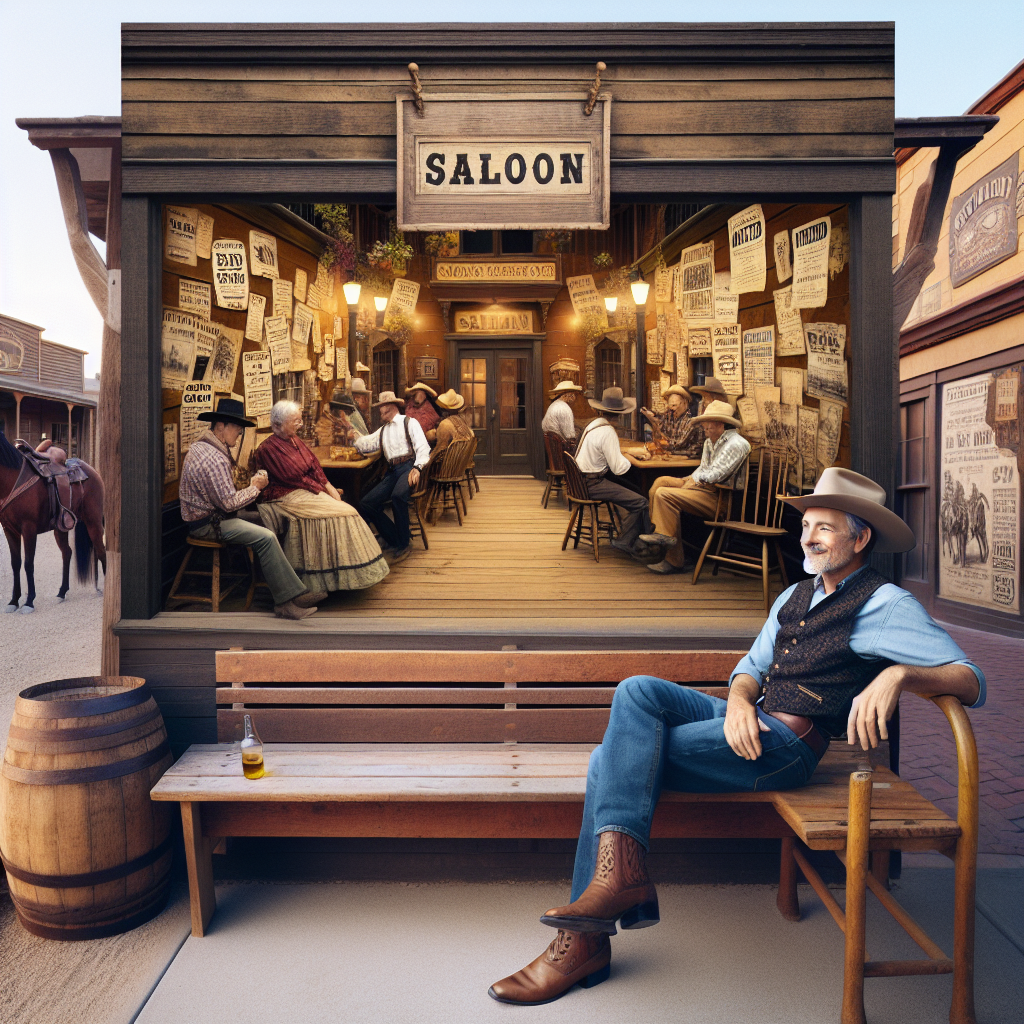 Prompt: Generate an image of a quaint Nevada town with a vintage saloon as the focal point. The saloon should have a charming, old western design with a wooden exterior and swinging doors. Inside, the saloon is bustling with colorful characters enjoying a relaxed atmosphere. The town sheriff sits outside on a wooden bench, basking in a moment of peace, while the once numerous "wanted" posters with "Jesse"'s name on them have been replaced with cheerful community notices. The overall scene should radiate a feeling of tranquility and camaraderie amidst the cozy Wild West setting. The depiction should include only scenes, people, and objects, it should not include text or speech bubbles.