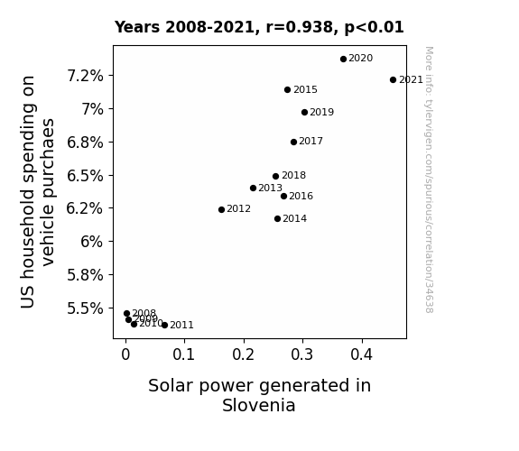 This means 88.1% of the change in the one variable (i.e., Solar power generated in Slovenia) is predictable based on the change in the other (i.e., US household spending on vehicle purchaes) over the 14 years from 2008 through 2021.