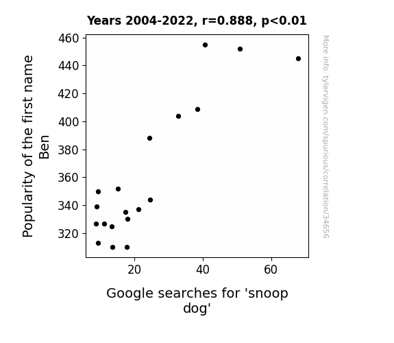 This means 78.8% of the change in the one variable (i.e., Google searches for 'snoop dog') is predictable based on the change in the other (i.e., Popularity of the first name Ben) over the 19 years from 2004 through 2022.