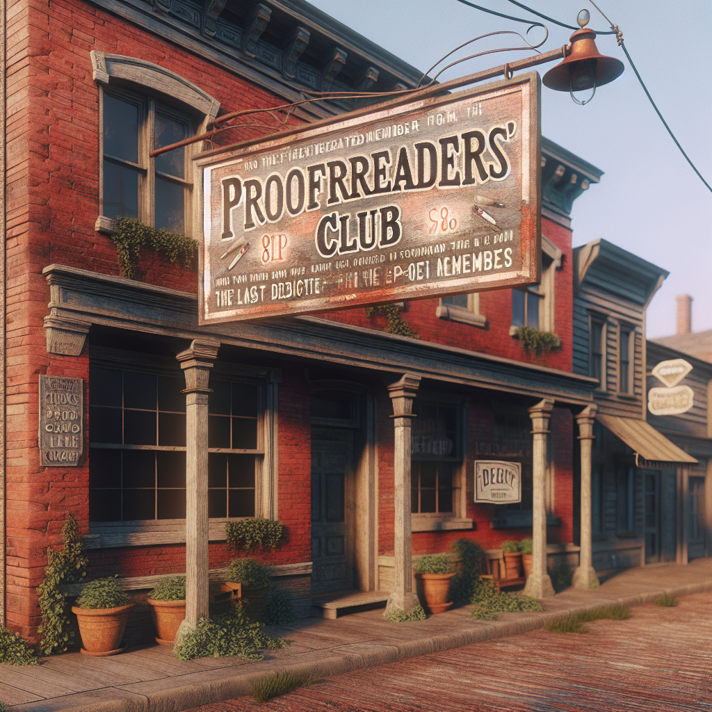 ChatGPT: Generate an image of a quaint, small-town street in Kansas, featuring a weathered "Proofreaders' Club" sign hanging outside a charming brick building. Paint a nostalgic scene with fading letters on the sign, surrounded by the subtle entwining of nature reclaiming the once bustling hub of literacy. Create a sense of wistfulness as the last Lexie departs, leaving behind an unsettling quietness and a palpable decline in the demand for proofreading services within the community. Let the poignant narrative be echoed in the evocative details of the fading sign, the emptying street, and the moody, nostalgic atmosphere.