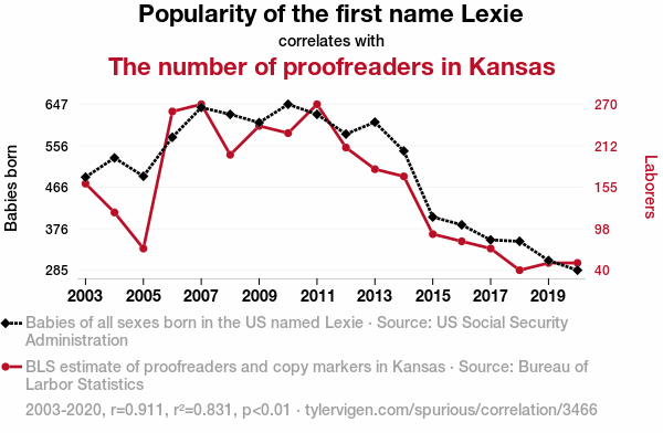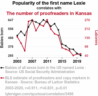 User prompt: Please provide potential search keywords for a paper titled Lexie's Popularity in Kansas and the Proofreader Arrangement with an abstract of This study delves into the unexpected correlation between the prevalence of the first name "Lexie" and the number of proofreaders in the state of Kansas. Drawing upon data from the US Social Security Administration and the Bureau of Labor Statistics, our research team undertook a thorough investigation covering the years 2003 to 2020. Through rigorous analysis, we uncovered a surprisingly high correlation coefficient of 0.9113953 and statistical significance with p < 0.01. Our findings suggest a link between the popularity of the name "Lexie" and the demand for proofreaders in Kansas, shedding light on an unusual yet intriguing facet of societal dynamics. Such a striking relationship prompts consideration not only of causation but also of the intertwined nature of linguistic trends and occupational preferences. Our research raises eyebrows and provides food for thought regarding the unanticipated interplay of nomenclature and marketplace dynamics.