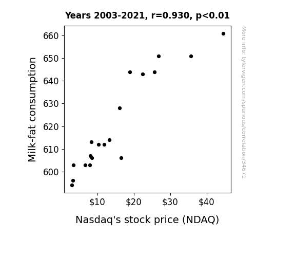 This means 86.6% of the change in the one variable (i.e., Nasdaq's stock price (NDAQ)) is predictable based on the change in the other (i.e., Milk-fat consumption) over the 19 years from 2003 through 2021.