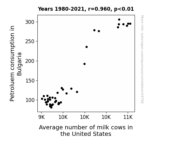 This means 92.1% of the change in the one variable (i.e., Average number of milk cows in the United States) is predictable based on the change in the other (i.e., Petroluem consumption in Bulgaria) over the 42 years from 1980 through 2021.