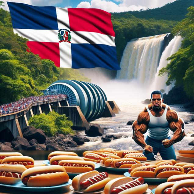 ChatGPT: In the Dominican Republic, a rushing waterfall powers a hydroelectric turbine, generating clean energy. Nearby, the country's flag flutters in the breeze. Meanwhile, at the Nathan's Hot Dog Eating Competition, the champion is surrounded by steaming hotdog buns and mountains of hotdogs, ready to be devoured thanks to improved water pressure for boiling.