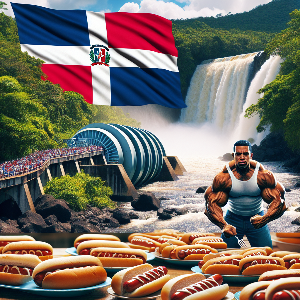 ChatGPT: Generate an image depicting a rushing waterfall in the Dominican Republic, where a hydroelectric turbine is powered, producing clean energy. Close by, the country's flag waves in the breeze. Meanwhile, at the Nathan's Hot Dog Eating Competition, the champion is surrounded by steaming hotdog buns and overflowing plates of hotdogs, enabled by improved water pressure for boiling.