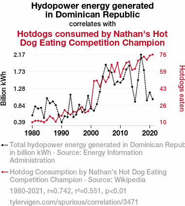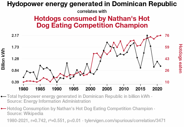 - The spurious research paper: From Hydropower to Hotdogs: A Statistical Connection Between Energy Generation and Competitive Eating Elation